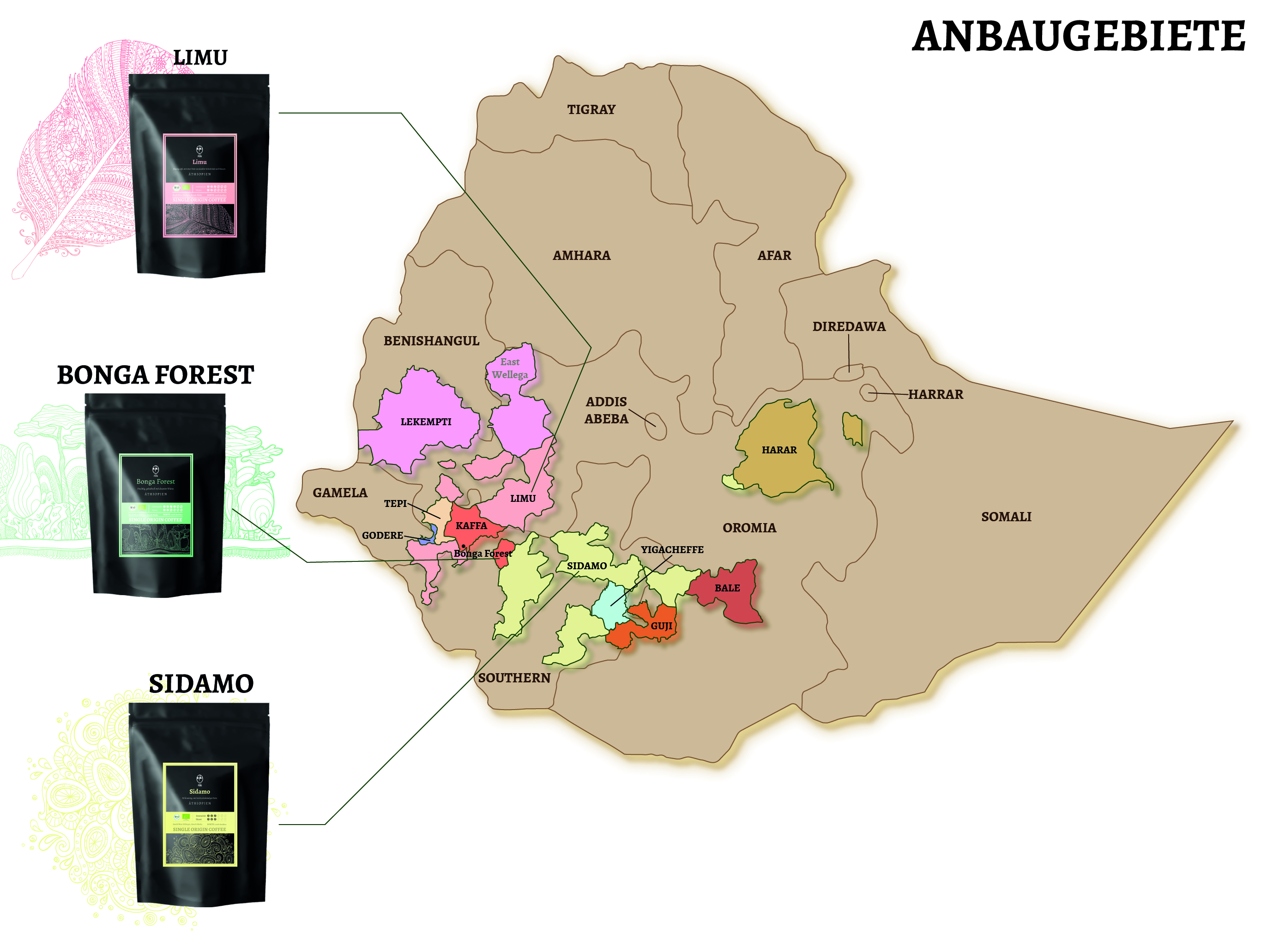Limu: Weiter westlich als der Bonga Forest wachsen auf 1.400 bis 2.100 Höhenmetern die Kaffeesträucher. Diese Anbaugebiet liegt auf fruchtbaren Waldboden und ist besonders bei den Amerikanern beliebt.