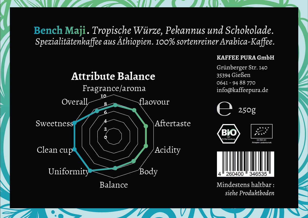 KAFFEE PURA Bench Maji Bio-Kaffee ist ein 100 % sortenreiner Arabica-Kaffee aus Äthiopien. Unser Kaffee ist Bio zertifiziert und steht für einen direkten, fairen Handel mit den Kaffeebauern Äthiopiens.