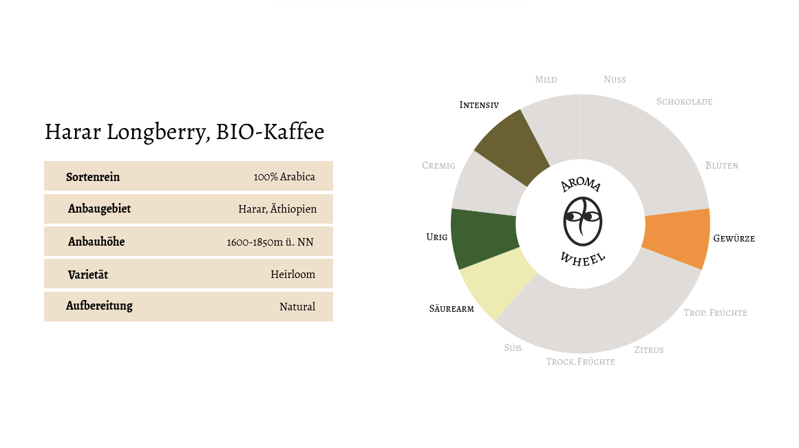 Unser Harar Longberry Kaffee beindruckt durch seinen faszinierenden, edlen Geschmack und seinem kräftigen Charakter. Wie ein im Barriquefass gereifter Rotwein entfaltet er ein dezent rauchiges Aroma, ergänzt durch feine Zimt- und Kardamomnoten. In arabischen Ländern wird Harar longberry bevorzugt als Mokka getrunken. Ein unvergessliches Geschmackserlebnis!
