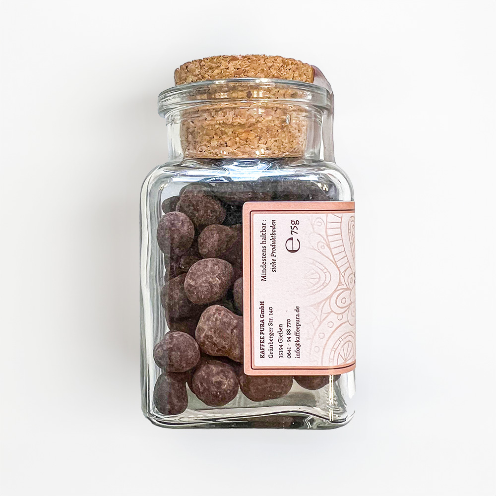 Unser sorgfältig gerösteter Sidamo-Kaffee entfaltet sein vollmundiges Aroma und wird anschließend liebevoll mit feinster Zartbitterschokolade überzogen. Das Ergebnis? Eine verführerische Geschmackskombination, die Ihre Sinne begeistern wird.